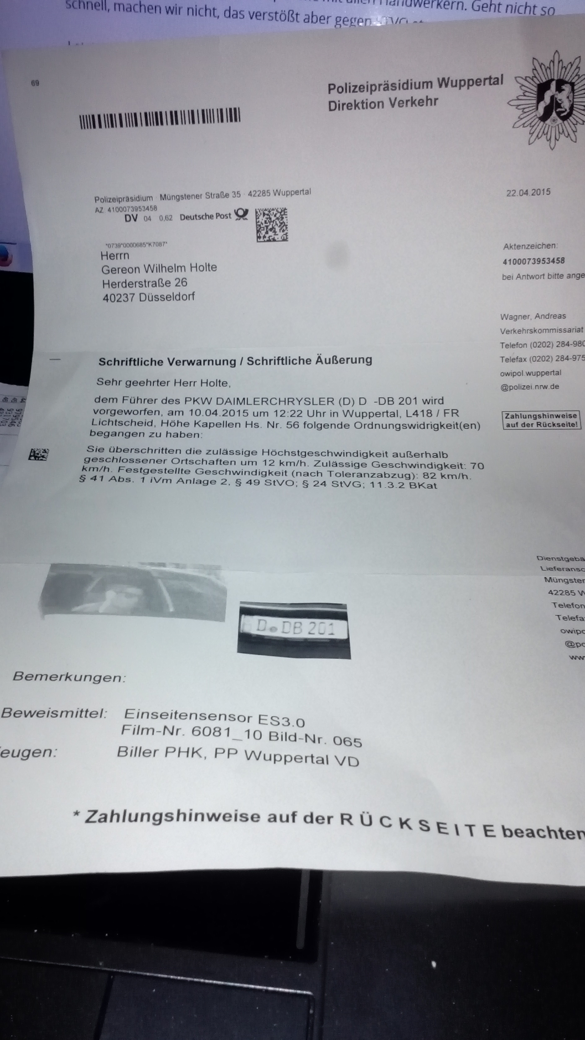 Wie auch immer, dem „Führer“ (Ich dachte wir hätten schlechte Erfahrungen mit „Führern“ 😀 ) des PKW DAIMLERCHRYSLER (D-DB 201) wird vorgeworfen (…) 12km/h zu schnell gewesen zu sein.